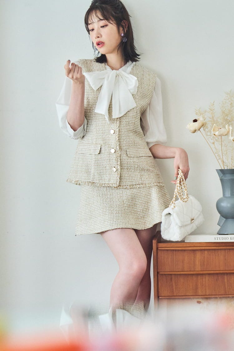 上品なツイードセットアップが主役のコーデ。フレアのミニスカが大人可愛いシルエットを演出♡ ブラウスの大きめリボンが顔まわりを華やかな印象に!白のミニバッグをあわせて清楚なコーデに仕上げました。