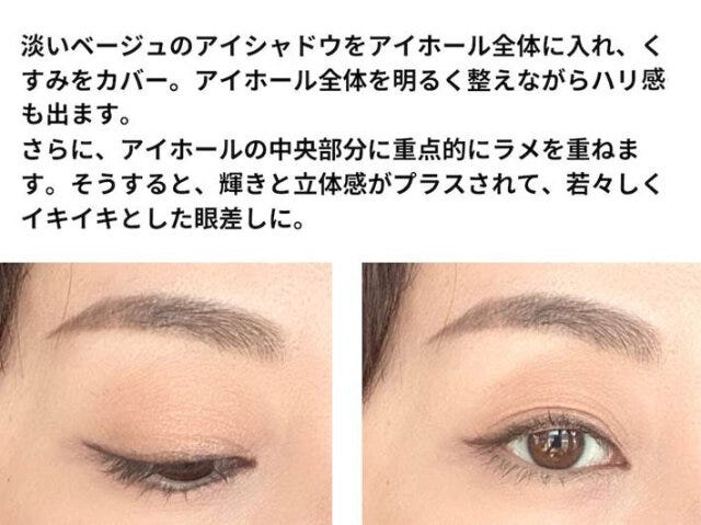 それらをカバーしたいなら、膨張色とラメの組み合わせがおすすめです。膨張色をアイホール全体に塗ることで目元にふっくらとしたハリが出て、ラメを重ねることで明るさと輝きが出ます。