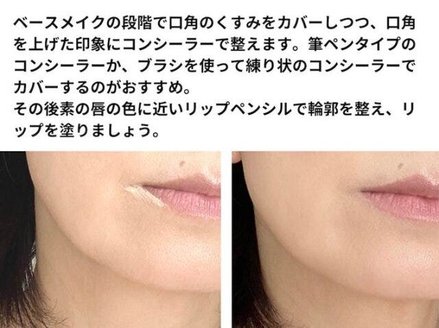 口角が上がって見えると、顔の下半分の印象も上向きなものに変えていくことができます。コンシーラーで口角が下がって見える原因となる影の部分を消して行きましょう。
