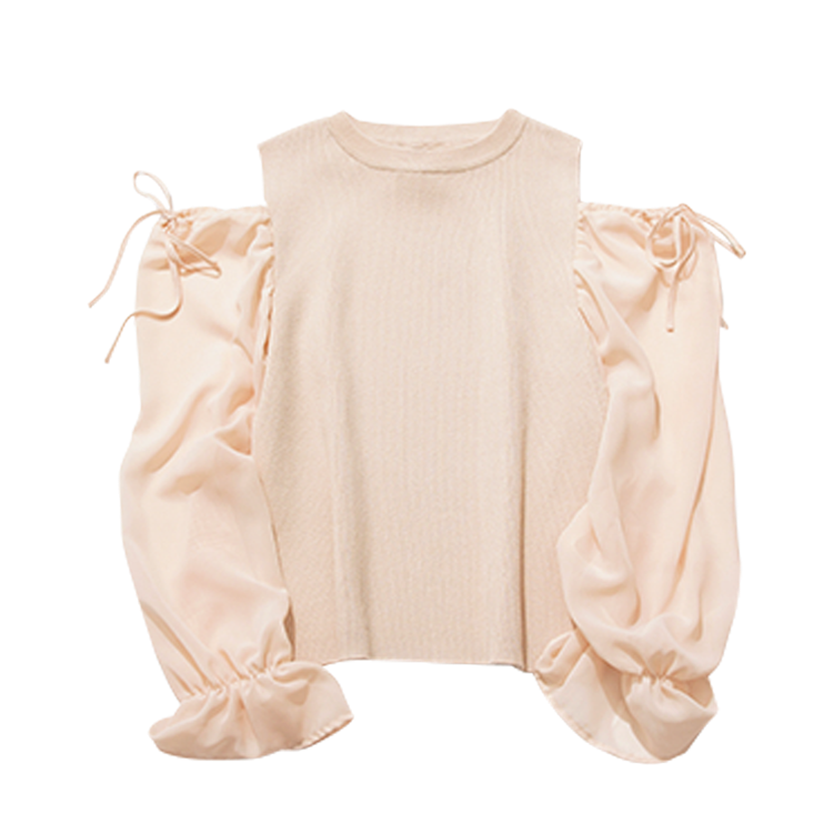 キャミとカーデを重ね着した風なデザインで、肩がチラッ。リブ編みのヘルシーさもちょうどいい。