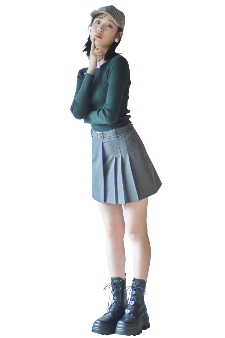 クールな色あわせのコーデ。程よくフィットするニットにミニスカをあわせて女のコらしいシルエットに♡ ビジューつきの厚底ブーツでガーリー要素をプラス!キャスケットを被れば一気に秋のムードが高まります。