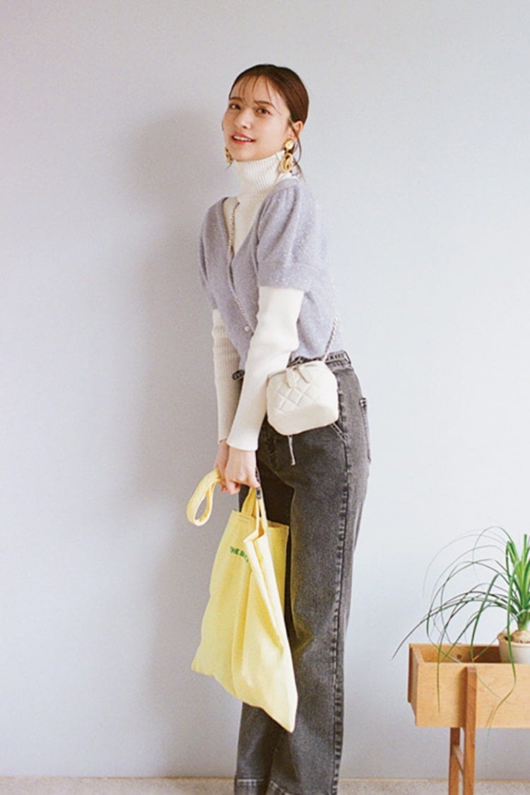 白タートルニット 1,870円/レトロガール(R1000) 2WAYラメカーディガン 5,390円、デニムセットアップ(パンツのみ使用) 9,900円/ともにOLIVE des OLIVE イヤリング 4,070円/マチルダローズ ミニバッグ 2,990円、イエロートートバッグ 1,990円/ともに神戸レタス Scene3 今日はインスタライブ♡ 動画映えする赤のスエットに決定!
