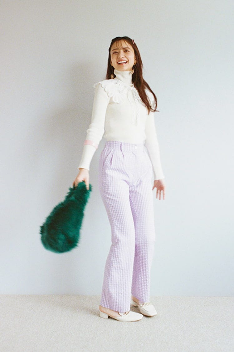 白タートルニット 1,870円/レトロガール(R1000) ギンガムパンツ 4,399円/W♥C つけえり 2,838円/flower イヤリング 3,960円/マチルダローズ バングル 8,640円/アビステ グリーンファーバッグ 9,900円/ル・ベルニ(キャセリーニ) ローファー 14,850円/ダイアナ(ダイアナ 銀座本店) Scene5 ついに1週間が終了ー!早速リールを作って投稿投稿っ!