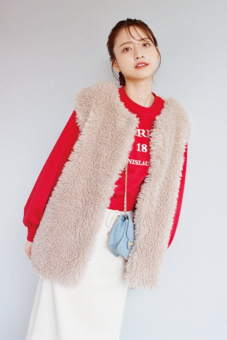 丈短ロゴスエット 2,530円、2WAYボアジャケット 6,490円/ともにエムズエキサイト(R1000) スエットスカート 6,990円/Gap デニムミニバッグ 7,689円/FREE’S MART Scene4 友だちと飲みに行く今日はタートル×つけえりでレディに