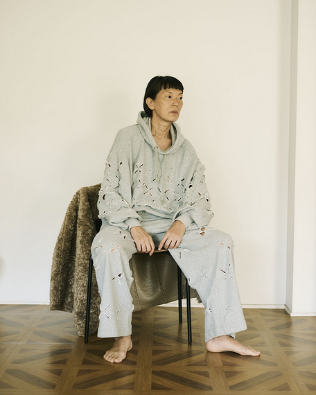 カジュアルなアイテムにも個性的なディテールを加え、ブランドらしさを演出している。細身のニットパンツにミニスカートを重ねたボトム(1万7930円)を出す。スウェットアイテムは、全体に斜め十字のカッティングを入れたセットアップや、ラインストーンをあしらったパンツ(1万7930円)、チュールで全体に覆ったプルオーバー(1万4850円)などがある。