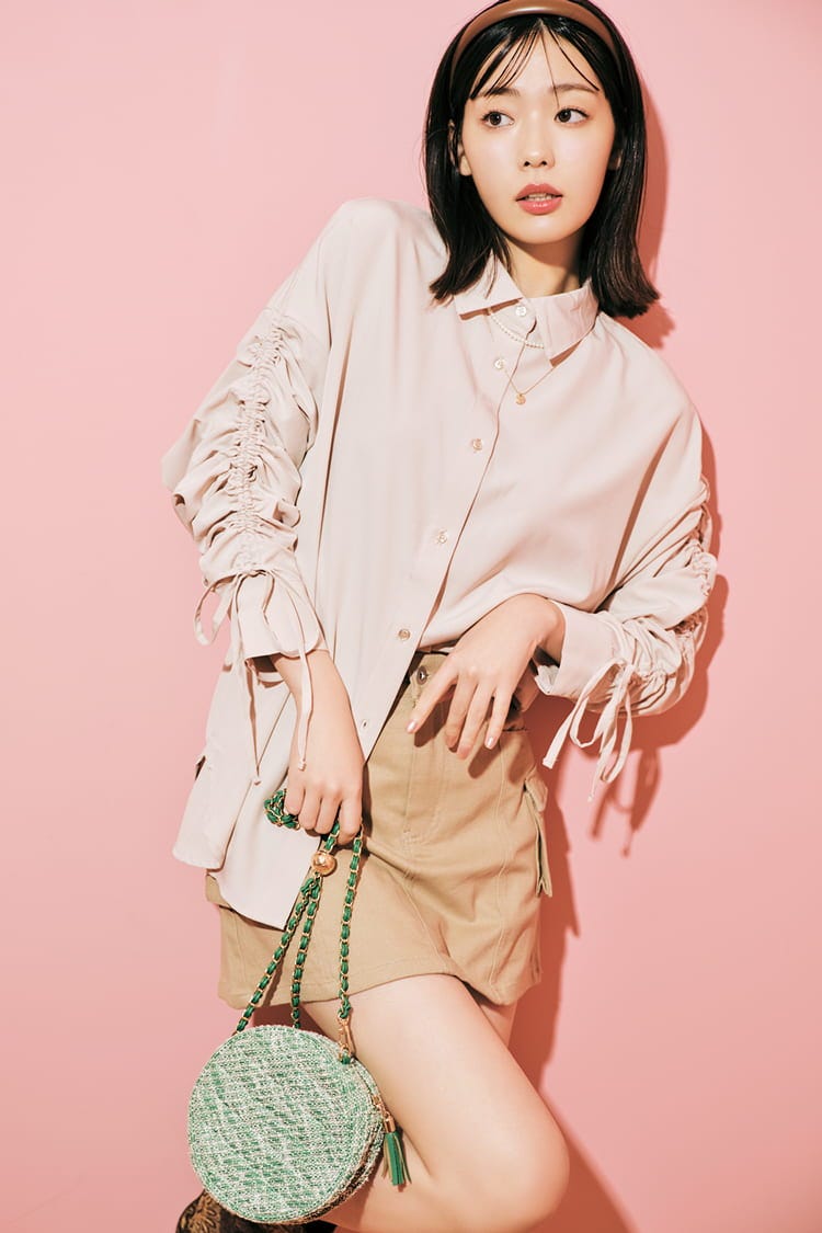 ベージュギャザーそでシャツ 1,499円、台形ミニスカート 2,099円/ともにGRL カチューシャ、2連ネックレス 各590円/GU グリーンサークルバッグ 6,270円/FREE’S MART ゴブランショートブーツ 8,900円/オリエンタルトラフィック(ダブルエー) 撮影/tAiki スタイリング/城田望(KIND) ヘア&メイク/後藤若菜(ROI) モデル/髙橋ひかる(本誌専属)、中村里帆 文/天井玖瑠海 撮影協力/PROPS NOW