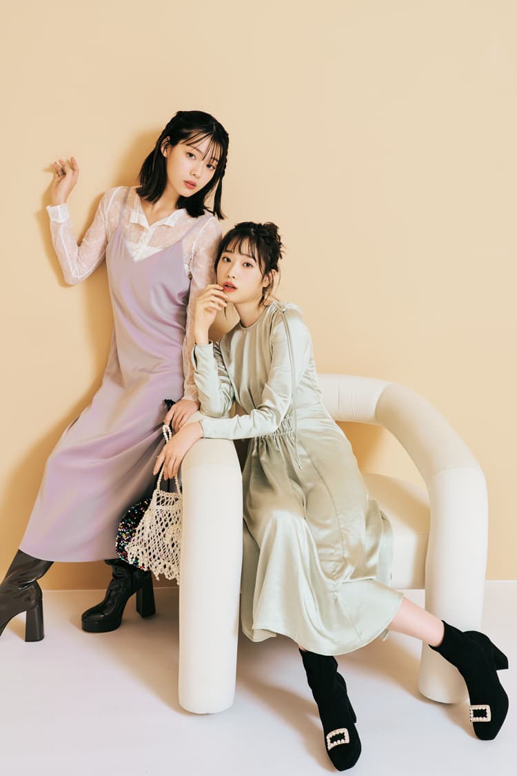 〈ひかる〉ミントギャザーワンピース 5,999円/H&M ビーズバッグ 9,900円/キャセリーニ 黒ビジューショートブーツ 30,800円/ダイアナ(ダイアナ 銀座本店)〈里帆〉グレーサテンキャミワンピース 2,490円/GU レーストップス 12,880円/BONNE スパンコールバッグ 5,940円/カシュカシュ(アンビリオン) ショートブーツ 14,900円/チャールズ&キース(チャールズ&キース ジャパン)