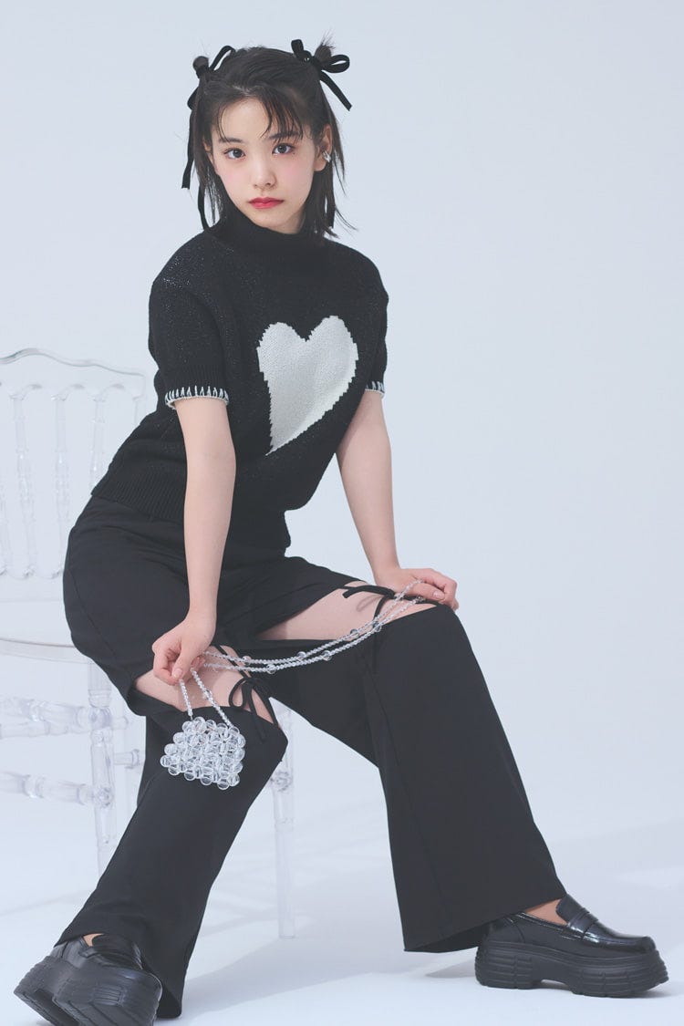 デザイン性にこだわるメリハリコーデエッジの効いたデザインで正面からのインパクトは絶大♡ 大きなハート柄と変形デザインの肌見せで、コーデにメリハリをプラス。