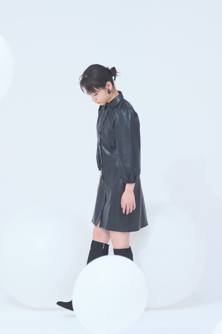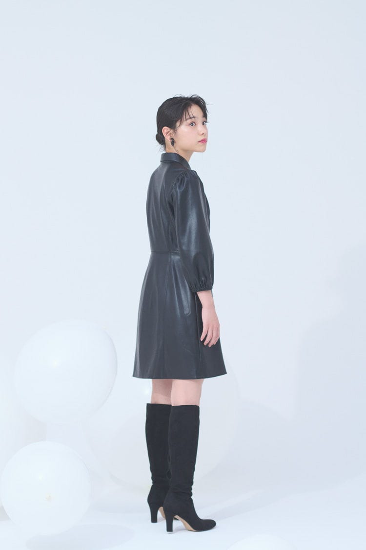 この秋大注目のレザーアイテム。1枚でサマになるワンピで取り入れれば、即秋仕様かつ女みが増し増し。黒のニーハイブーツからのぞく素肌がよりビターな色気も出してくれる。