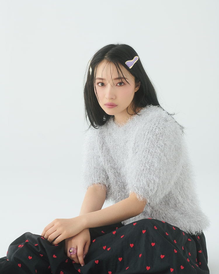 トレンド感のあるキラキラニットを使ったコーデ。ボリュームのある袖で二の腕の華奢見せを叶える!ガーリーなハート柄スカートをあわせても、グレーのトップスが甘さを抑えてコーデのバランスをとってくれます。大きめのヘアピンは小顔効果も◎。