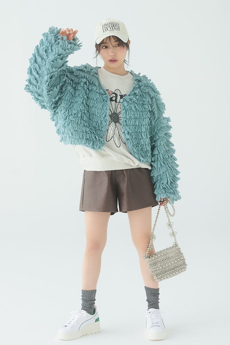 ブルーループニットカーディガン 17,380円/ブライト レインボー(BLAST) スエット 11,900円/Mardi Mercredi(MUSINSA JAPAN) ショートパンツ 2,750円/レトロガール(R1000)キャップ 5,500円/AMAIL バッグ 9,900円/キャセリーニ ソックス 1,980円/コントロールフリーク(キャセリーニ) スニーカー 14,300円/PUMA(アトモス ピンク フラッグシップ 原宿) お目立ちロングコート