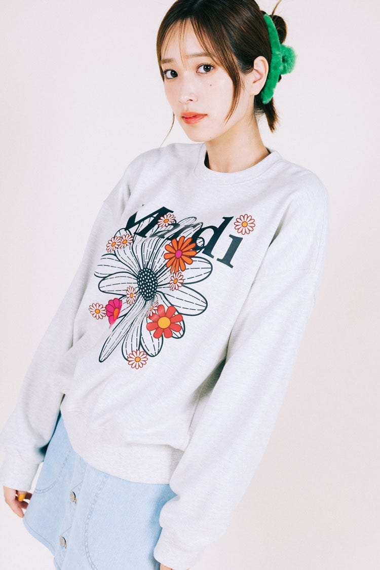 Mardi Mercrediのトレードマーク、花柄のスエットはミニスカートをあわせてシンプルに。Kガールの定番ミニ丈に、POPなカラーのヘアアクセでカジュアルに仕上げる!通学にもぴったりなコーデ。