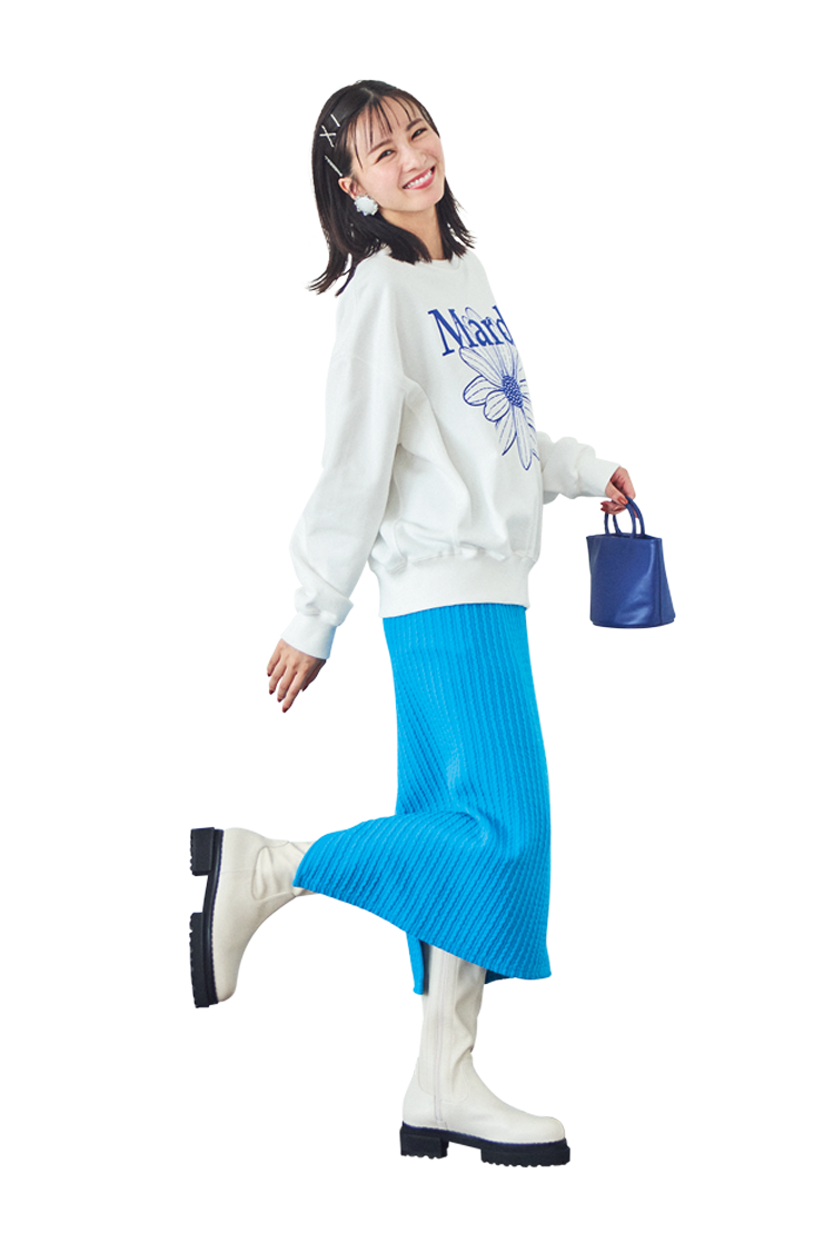 ロゴスエット 9,713円/Mardi Mercredi(MUSINSA GLOBAL STORE) ブルーリブニットスカート 11,550円/AMAIL イヤリング 6,300円/アビステ ブルーバッグ 21,000円/yhel(スクリーンショット) アイボリーブーツ 29,700円/ダイアナ(ダイアナ 銀座本店)ヘアピン/スタイリスト私物 寒くなってきたら……アウターをON!