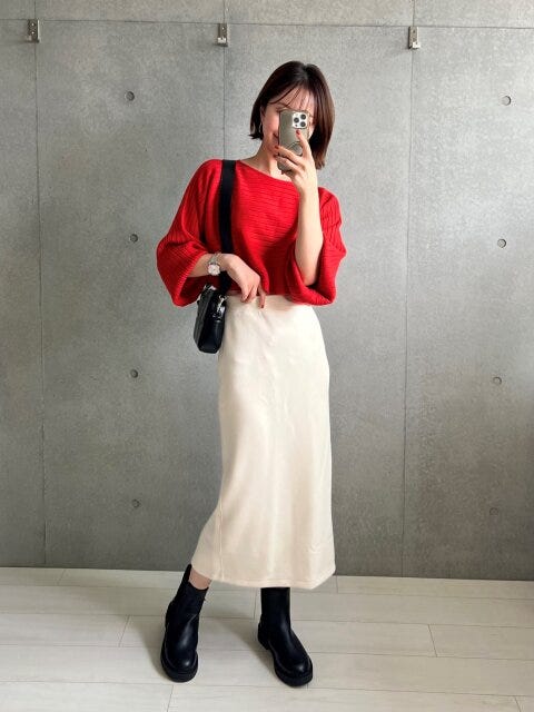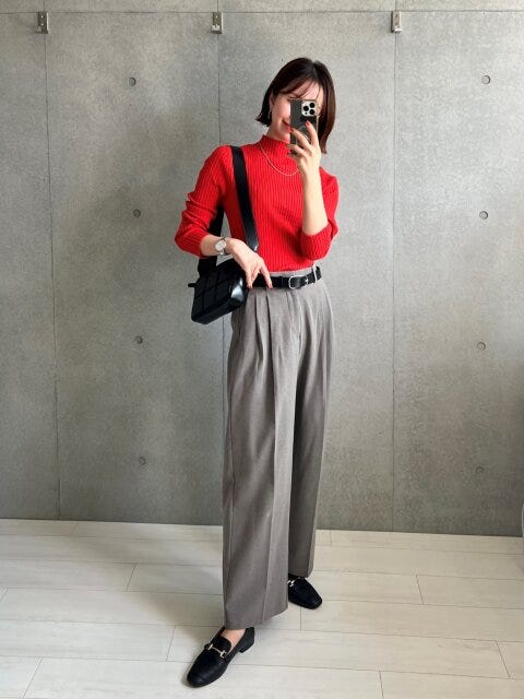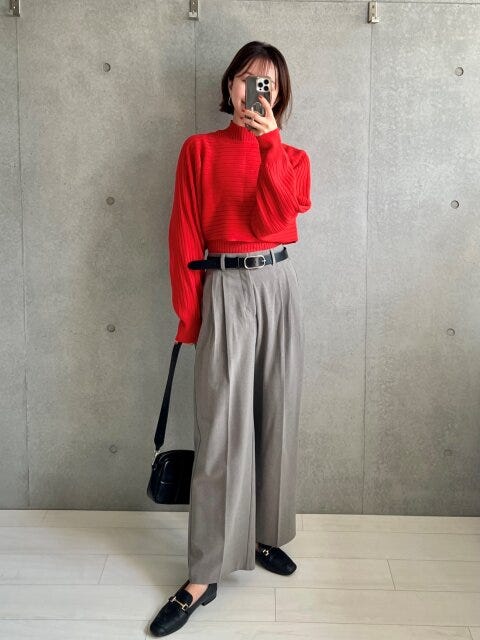 ゆったりしたセーターなので足元にもしっかりボリュームを作って全体のバランスを整えます。柔らかい印象にしたい場合はアイボリーや淡いベージュとあわせてあげるのがおすすめです。