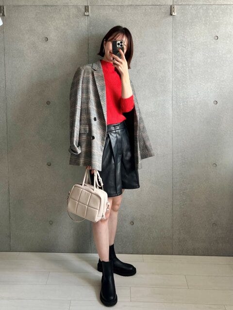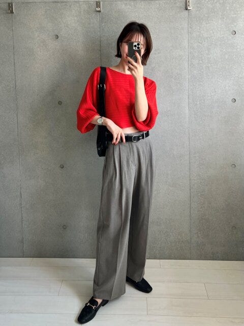 赤はグレーとあわせてあげるとコントラストがつきすぎず柔らかい印象で取り入れられます。ショートパンツでカジュアルさもプラス。