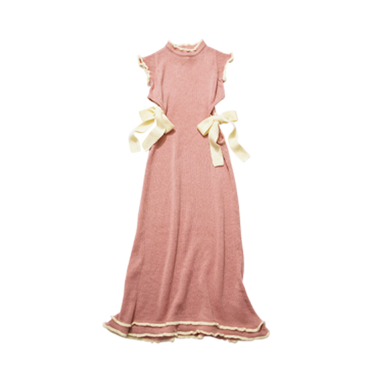 カットアウトされたウエストに大きなニットリボンをかぶせた、甘口なハダチラ。首まわりや袖口のさりげないフリルが可愛い。