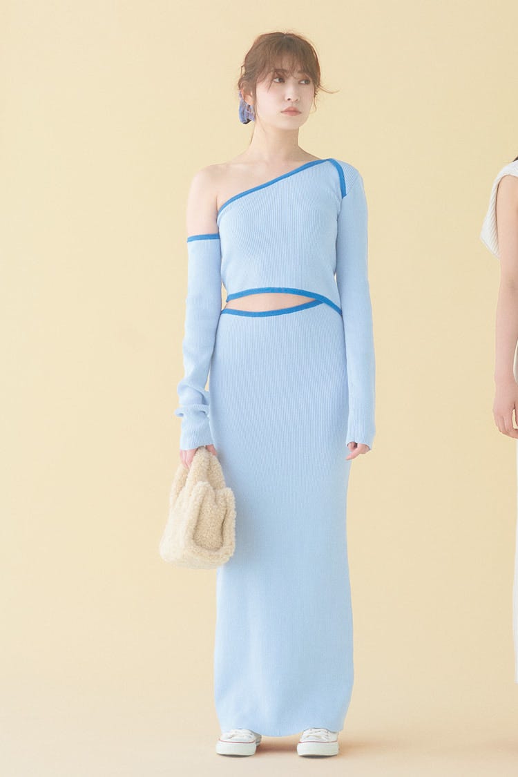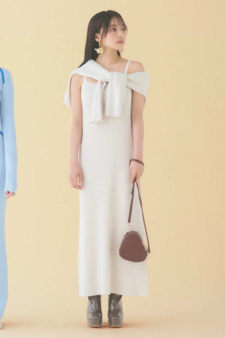 アシンメトリーなカットアウトでモード顔肩とウエストそれぞれ片側だけちらりと肌が見えるユニークなデザイン。1枚でサマになるモードなニットワンピを、スニーカーやボアバッグでカジュアルに引き寄せるスタイリングに。
