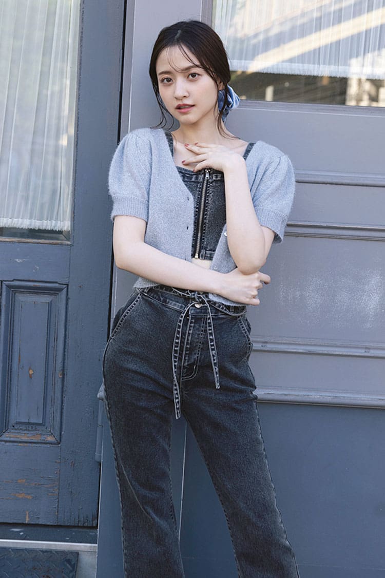 2WAYラメカーディガン 5,390円/OLIVE des OLIVE デニムセットアップ 9,900円/OLIVE des OLIVE ベロアシュシュ 5,390円/POTETE 撮影/島田彩枝加(Luuna Management) スタイリング/城田望(KIND) へア&メイク/サイオチアキ(Lila) モデル/金川紗耶(本誌専属) 文/天井玖瑠海