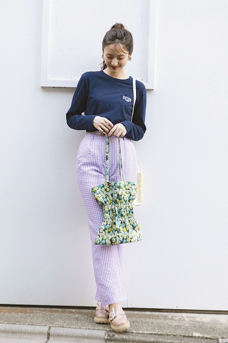 ネイビーロンT 7,980円/épine ギンガムパンツ 4,399円/W♥C イヤリング 7,020円/アビステ ベルト 3,168円/flower トートバッグ 6,050円/キャセリーニ ミニボアバッグ 4,290円/ACCOMMODEルミネエスト新宿店 ローファー 8,500円/オリエンタルトラフィック(ダブルエー) Scene5 今日は授業が休講でおうちday。アンチコメントってやっぱり傷つくな……