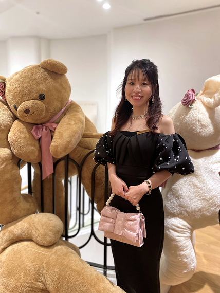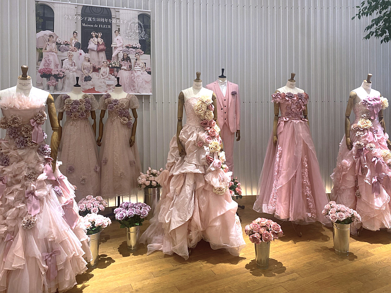 会場は3フロアを使った。一つは10周年のアーカイブを展示した。ドレスを着せ付けた10体のトルソーや、過去の商品の写真をコラージュしたパネルなどを飾った。ドレスはピンクをベースにブランドの象徴である、リボンや花を装飾し、空間を華やかにした。