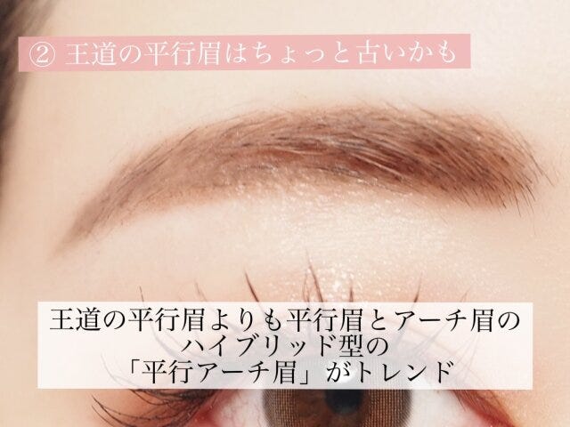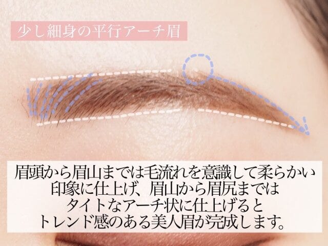 王道の平行眉がダメなわけではありませんが、最近は平行眉とアーチ眉のハイブリッドタイプの、平行アーチ眉に切り替えている方が増えています。平行アーチ眉は、眉頭から眉山までの上下の線を平行に描き、眉山から眉尻まではアーチ状に描きます。