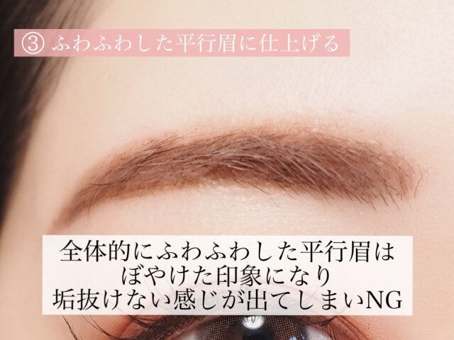 平行眉をふわふわ仕上げにすることはいいのですが、眉尻までふわふわにしてしまうのはNGです。全体的にぼやけて、なんだか垢抜けない印象になってしまいます。