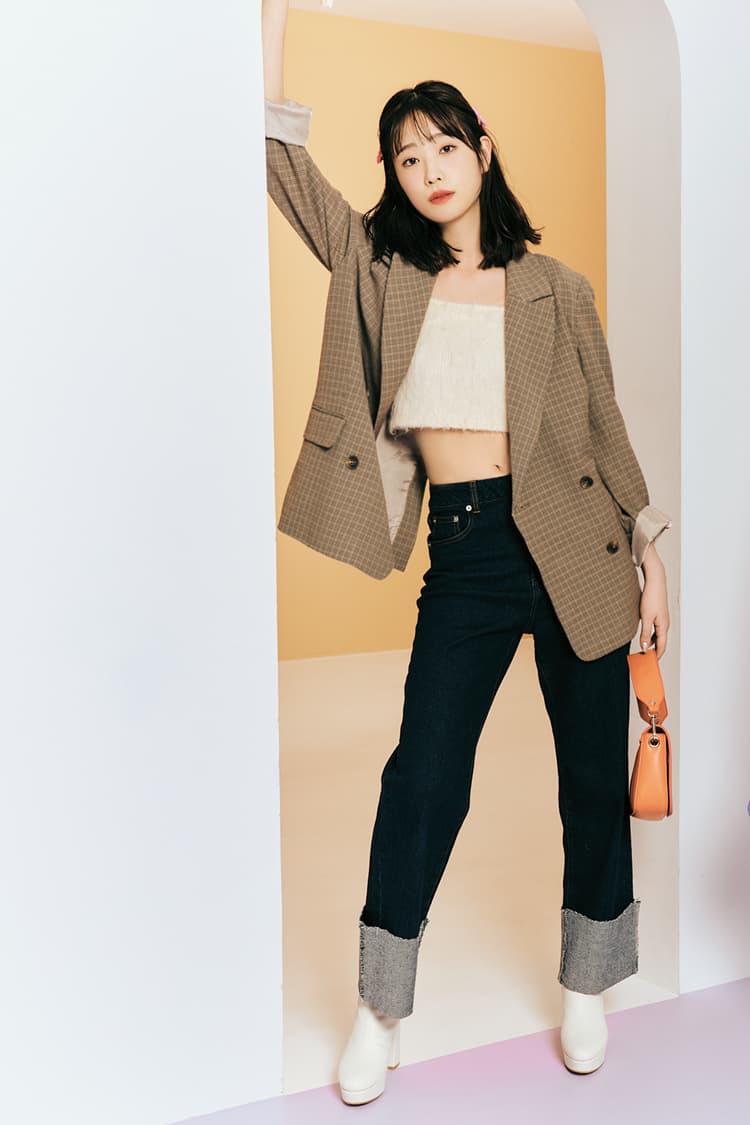ロールアップデニムパンツ 2,990円/神戸レタス チェックジャケット 9,000円/FREE’S MART ニットビスチエ 3,960円/ワンアフターアナザー ナイスクラップ ヘアピン(4本セット) 1,980円/POTETE オレンジバッグ 5,390円/カシュカシュ(アンビリオン) 白ショートブーツ 25,300円/ダイアナ(ダイアナ 銀座本店) Item4 パールつきデニムパンツ