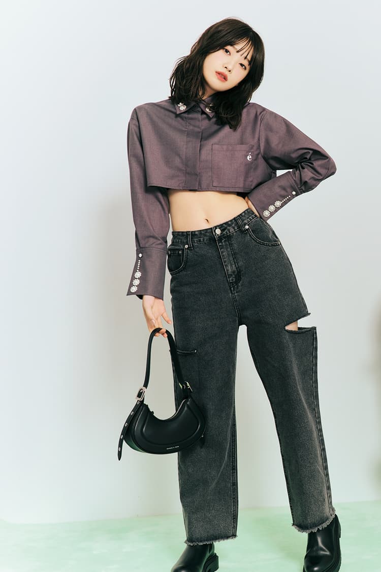 黒サイドカットデニムパンツ 3,850円/エムズエキサイト(R1000) グレーショートシャツ 10,880円/épine 黒バッグ 10,900円/チャールズ&キース(チャールズ&キース ジャパン) サイドゴアブーツ 3,990円/GU
