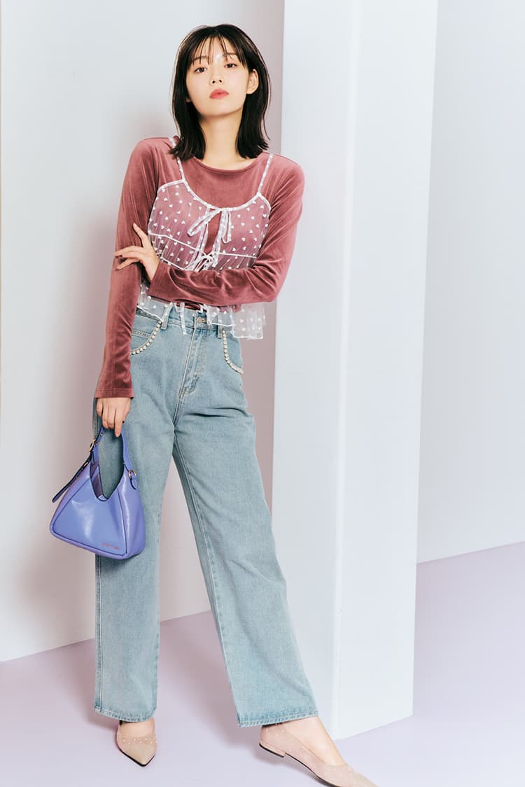 パールつきデニムパンツ 4,290円/レトロガール(R1000) ベロアTシャツ 1,490円/GU ハート柄チュールビスチエ 4,950円/w closet(WEARS INC.) パープルバッグ 14,900円/チャールズ&キース(チャールズ&キース ジャパン) フラットシューズ 8,690円/RANDA 撮影/tAiki スタイリング/城田望(KIND) ヘア&メイク/後藤若菜(ROI) モデル/髙橋ひかる(本誌専属)、中村里帆 文/天井玖瑠海 撮影協力/PROPS NOW