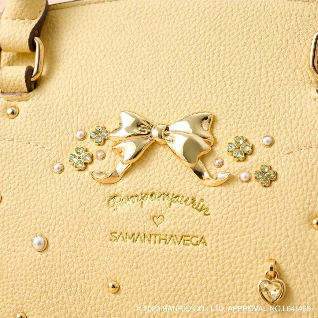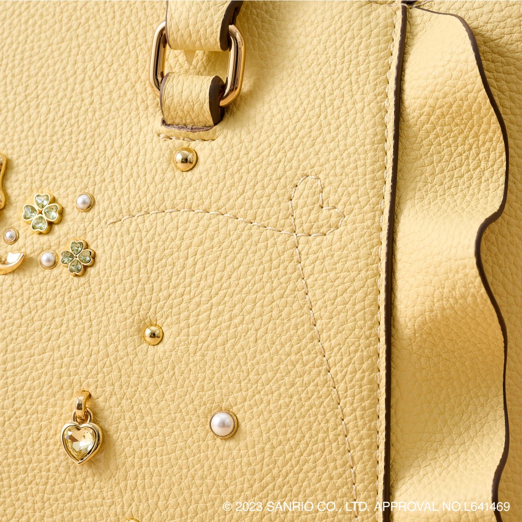 「ポムポムプリン」をイメージしたイエローをメインに、オリジナルのリボンや、クローバーのビジュー、揺れるハートのビジューがポイントのフラッターが登場。バッグの縁や持ち手のコバには、ポムポムプリンをイメージしたブラウンを使用されている。
