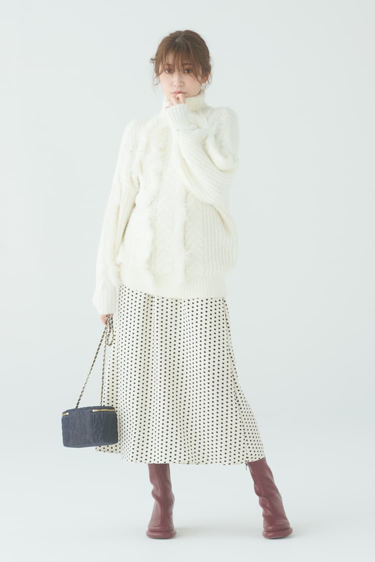 ニットとスカートを白でまとめて、ほわほわ感をアピール。さりげなく縦ラインを仕込んだニットの編み目と、レディな小物でゆるくなりすぎをセーブして。ゆるタートルに顔をうずめて、あざとく魅せる♡