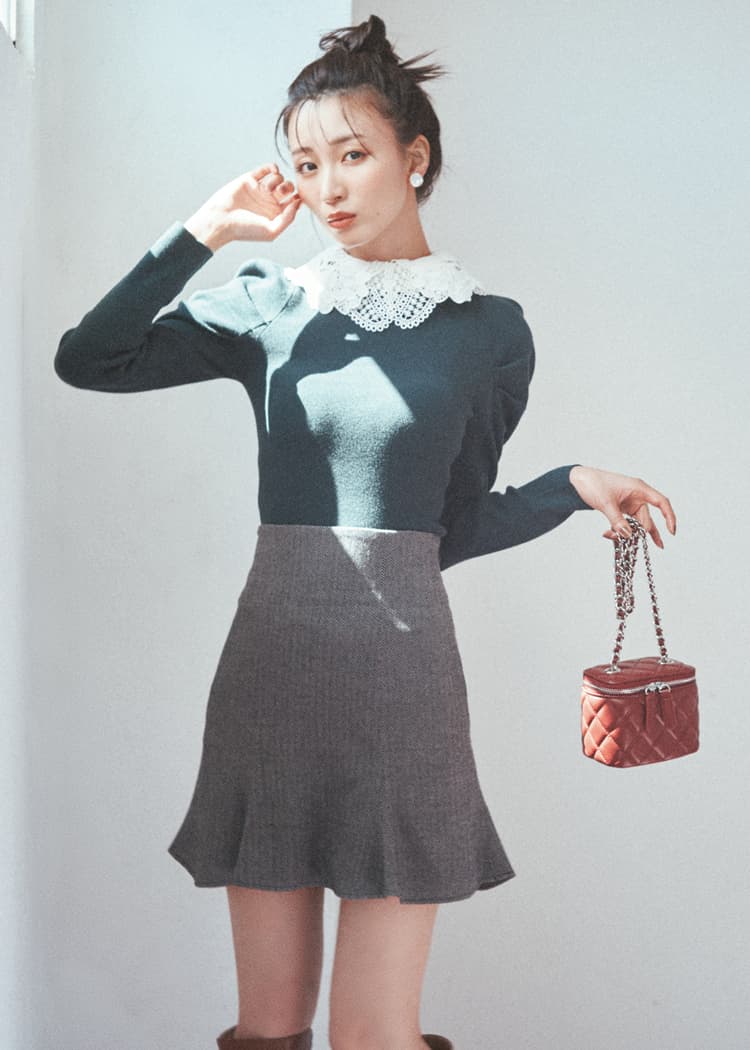 ガーリーなえりで顔まわりを盛って ハイウエストのミニスカが華奢見えシルエットを演出 シックなカラーのアイテムで季節感を意識♡