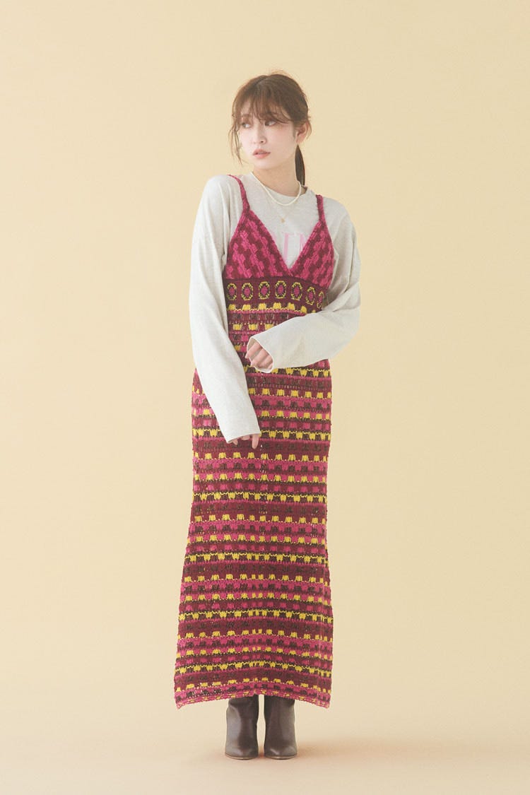 こっくりカラーのエスニック柄で秋感たっぷり。色も柄もマルチなニットワンピース。ラフなロンTにさらっと重ねるだけでもおしゃれ度がぐっと高まる。