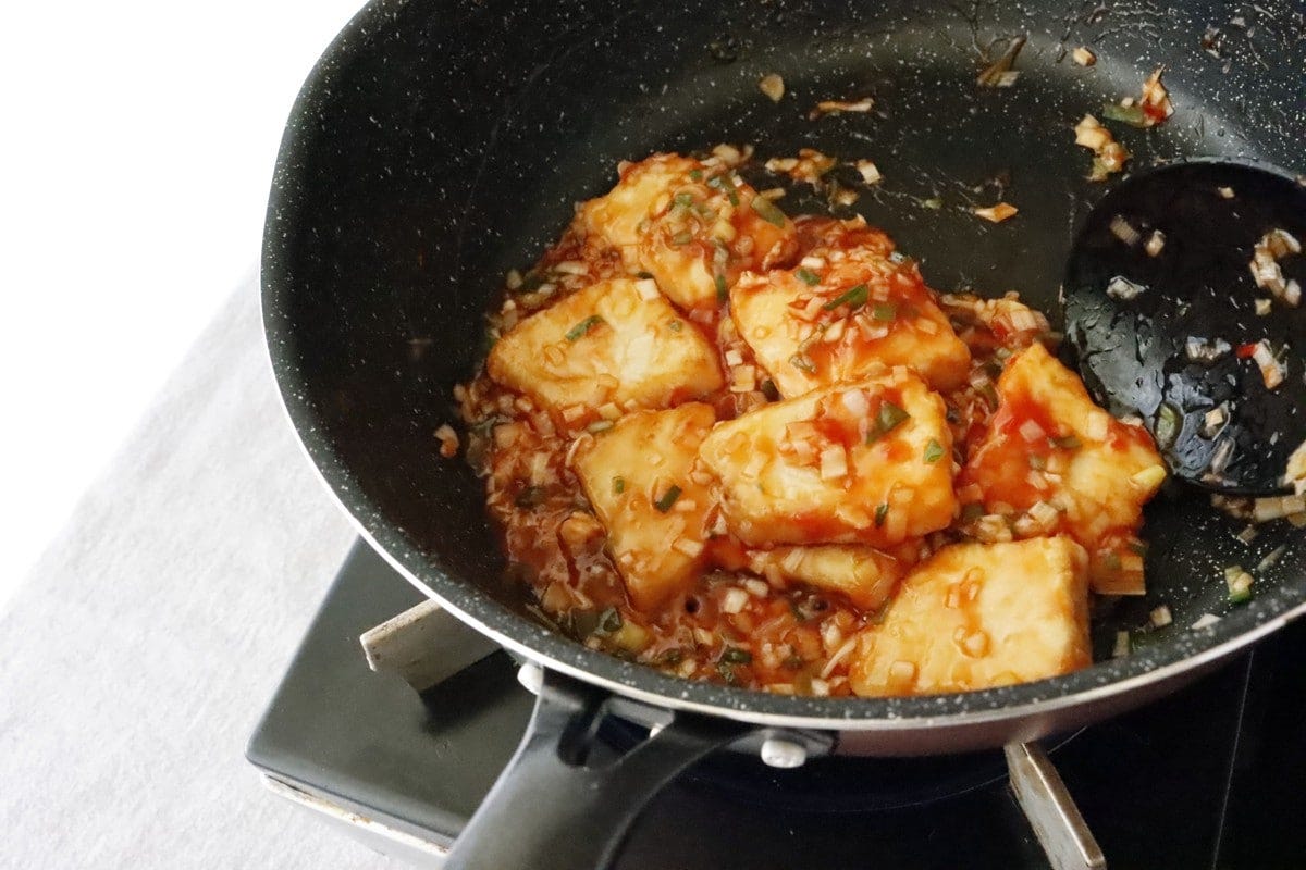 弱火にし、スイートチリソース、ケチャップ、醤油を入れ、全体を炒め合わせる。最後にこしょうを振って完成。