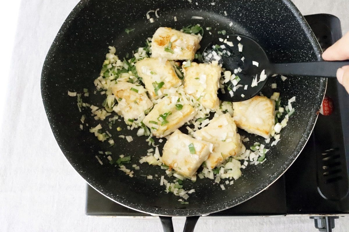 3に2を加え、長ねぎがしんなりするまで炒める。