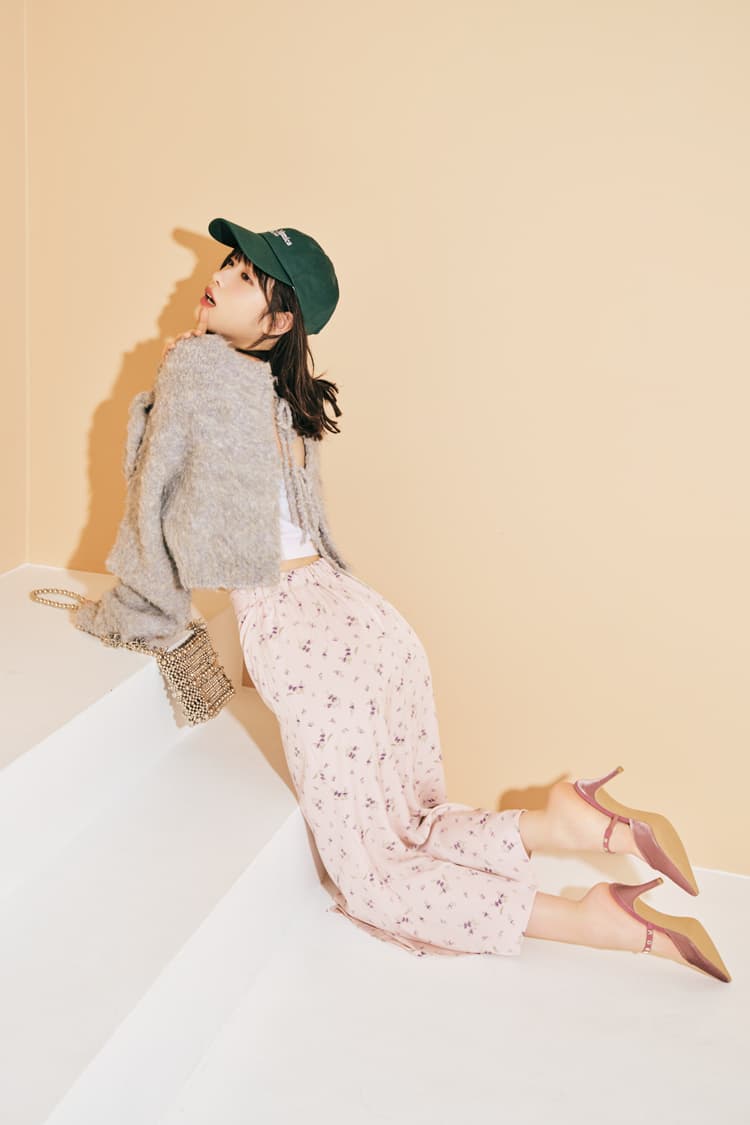 バックリボンカーデ 3,990円/WEGO 花柄スカート 8,778円/flower キャップ 2,090円/カシータ(R1000) ミニバッグ 9,900円/キャセリーニ ミュール 16,500円/ダイアナ(ダイアナ 銀座本店) 中に着たインナー/スタイリスト私物