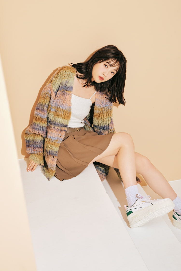 マルチボーダーニットカーディガン 5,499円/WEGO グレーキャミソール(スエットとセット) 6,490円/OLIVE des OLIVE プリーツスカート 3,299円/W♥C ソックス 1,290円/Gap スニーカー 14,300円/PUMA(アトモス ピンク フラッグシップ 原宿)