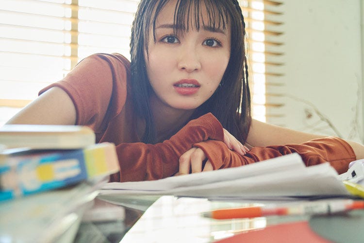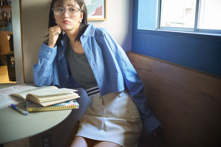 シャツとタンクトップのセット 12,100円/3.3 Field Trip/ALAND(アダストリア) スカート 4,399円/Figments めがね 20,900円/Double Lovers(スクリーンショット) イヤリング 7,350円/アビステ ヘアピン/スタイリスト私物 アームウォーマーとベロアトップスのセット