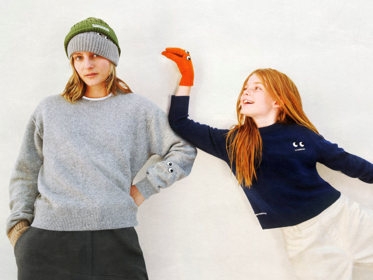 「ユニクロ×アニヤ・ハインドマーチ」は、目のモチーフやステッチがアクセントのウィメンズのセーター2型(税込み3990円と1万2900円)、キッズのセーター1型(2990円)、マフラー、ニットキャップ、靴下、バッグ(590~1990円)を企画した。