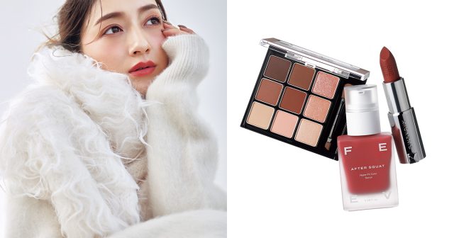 ひとつ目は、赤を思いっきり堪能した、寒空に映えるような温かみのあるメイク。定番の血色メイクと似ているようで、ちゃんと今っぽいのは、マットな赤茶、艶っぽい朱赤、こっくりしたボルドーと色味や質感の違うさまざまな赤を重ねているから。
