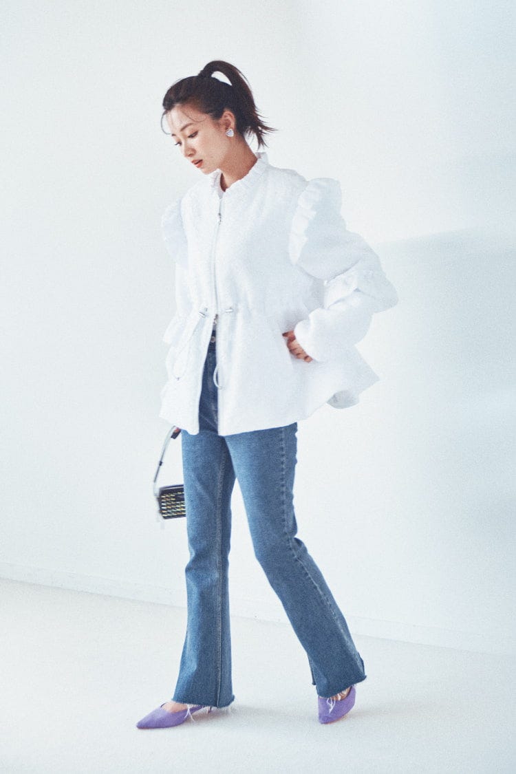 大ぶりフリルをフレアーデニムですっきりと魅せる。足元の紫のシューズが差し色になるよ◎。