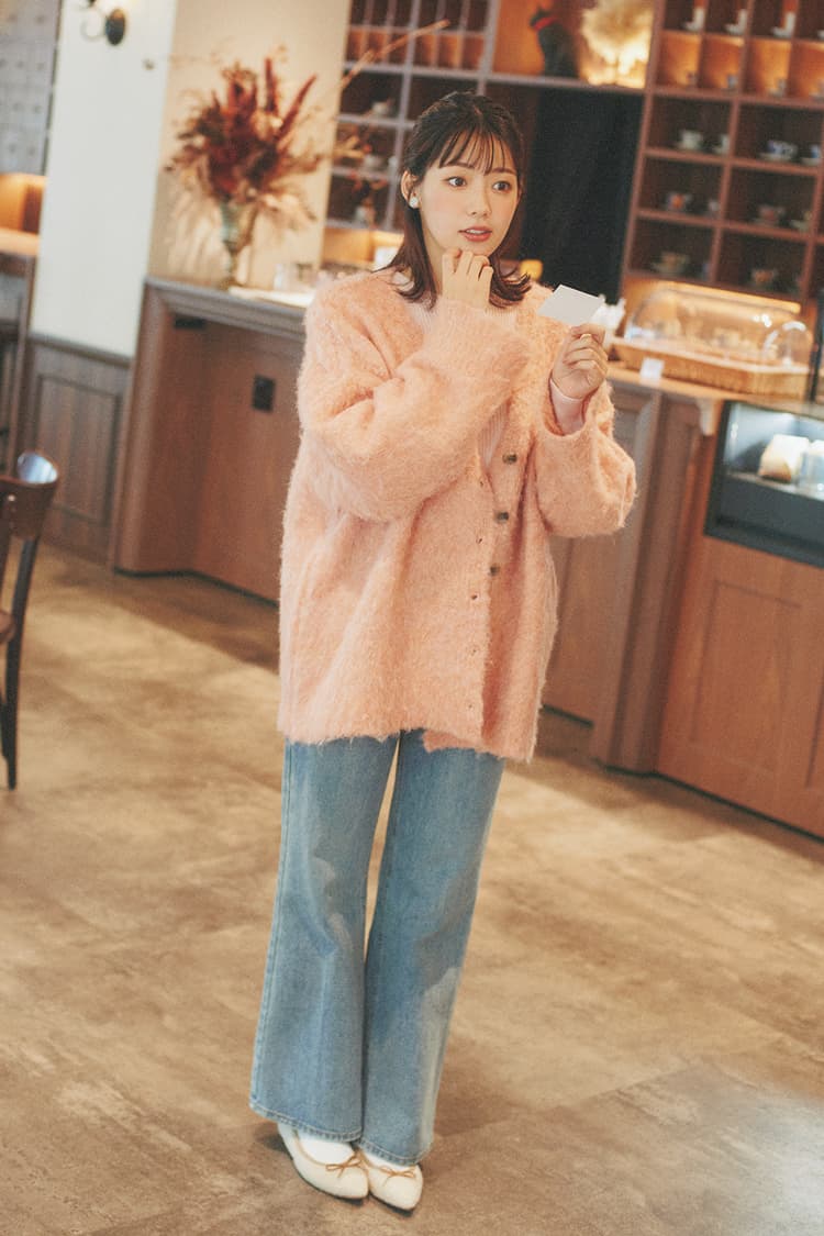 起毛カーディガン 6,490円/w closet(WEARS INC.) リブニットトップス 8,980円/épine デニムパンツ 14,300円/ACYM イヤリング 1,650円/アネモネ(サンポークリエイト) ソックス 660円/靴下屋(Tabio) バレエシューズ 14,850円/ダイアナ(ダイアナ 銀座本店) Scene5 同級生のタクヤくんに宿題を教えてもらったよ