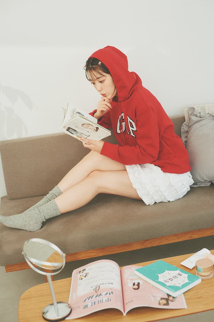 レッドロゴパーカ 5,990円/Gap フリルミニスカート 9,890円/épine リング 330円/パリスキッズ 原宿店 ソックス 1,650円/靴下屋(Tabio) ヘアクリップ/ヘア&メイク私物 Scene3 美容クリニックで肌メンテ。ベロアで女っぽくしてみた♡
