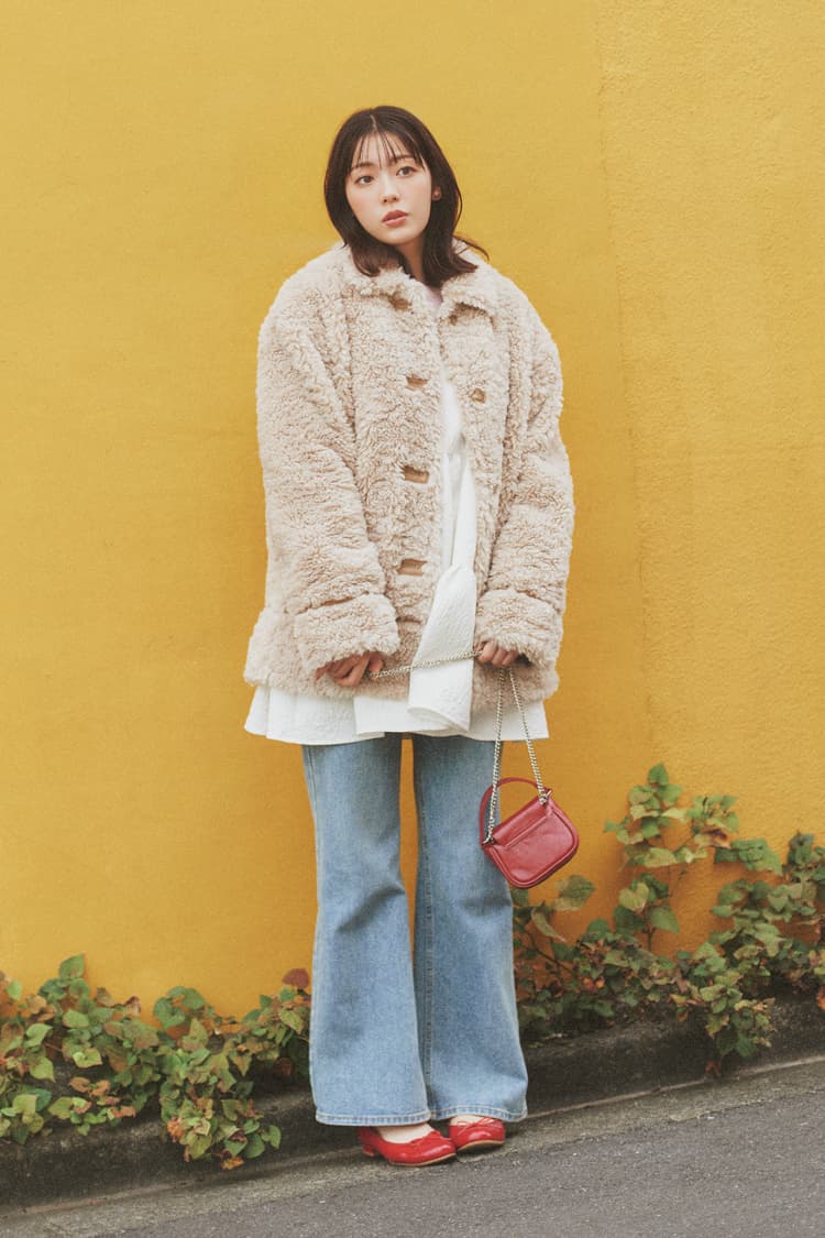 ボアハーフコート 25,300円/レイ ビームス(レイ ビームス 新宿) ジャカードリボンワンピース 27,500円/HONEY MI HONEY デニムパンツ 14,300円/ACYM イヤリング 3,780円/アビステ バッグ 9,777円/Fillin theblank(MUSINSA GLOBAL STORE) バレエシューズ 14,850円/ダイアナ(ダイアナ 銀座本店) Scene2 自分磨きのために情報収集!おしゃれも美容もアプデするよ
