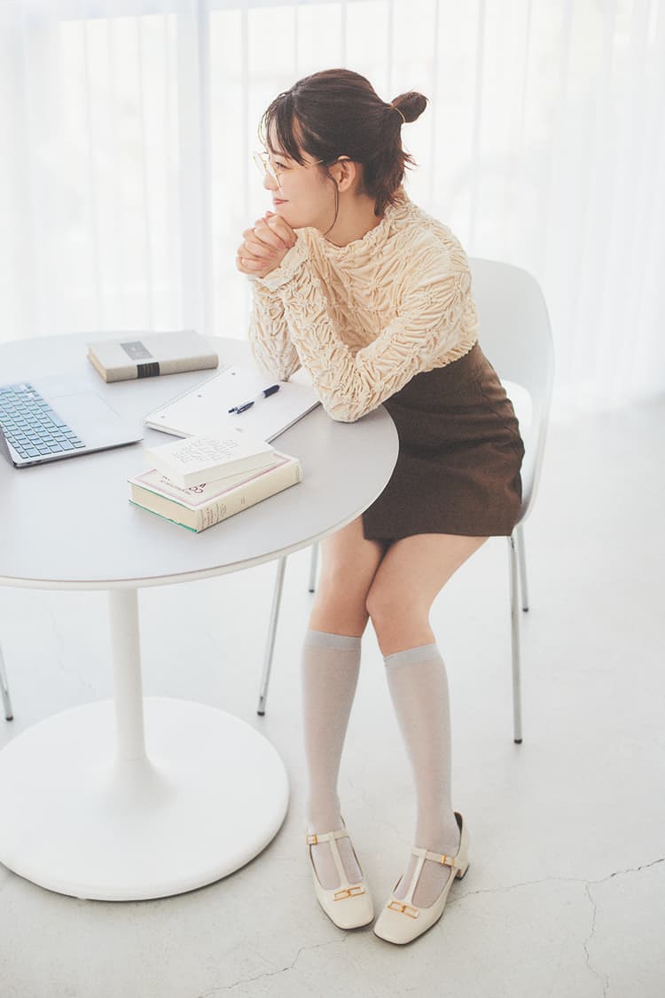 シャーリングトップス 10,450円/レイ ビームス(レイ ビームス 新宿) ショートパンツ 11,000円/ACYM 眼鏡 19,800円/Double Lovers(スクリーンショット) ハイソックス 1,320円/靴下屋(Tabio) パンプス 15,900円/チャールズ&キース(チャールズ&キース ジャパン) ヘアゴム/スタイリスト私物 りほの愛されテク