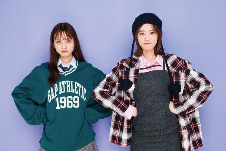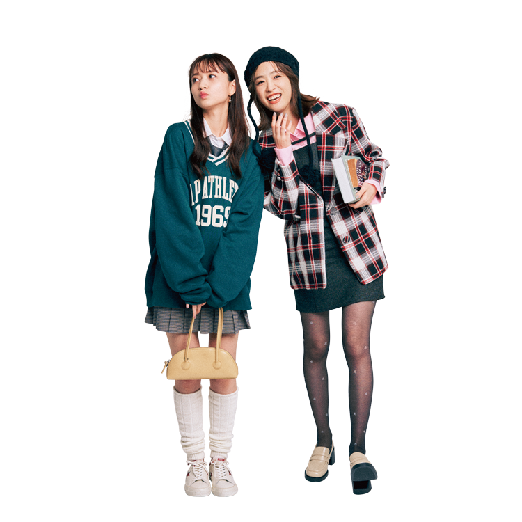 〈HIKARU〉赤チェックジャケット 16,500円/Darich(YSM) グレーキャミワンピース 8,800円/RESEXXY ピンクショートシャツ 9,790円/atmos pink(アトモス ピンク フラッグシップ 原宿) ニット帽 3,960円/Alley by w closet(WEARS INC.) ローズ柄ストッキング 1,100円/靴下屋(Tabio) ローファー 10,900円/チャールズ&キース(チャールズ&キース ジャパン)〈SAYA〉グリーンロゴトレーナー 6,990円、白シャツ(オンラインショップ限定) 7,990円/ともにGap ミニスカート 6,990円/MANGO LOCONDO) イヤリング 5,460円/アビステネクタイ 2,750円/jouetie バッグ 34,452円/MARGE SHERWOOD(MUSINSA GLOBAL STORE) ルーズソックス 1,540円/靴下屋(Tabio) スニーカー 24,200円/コンバース