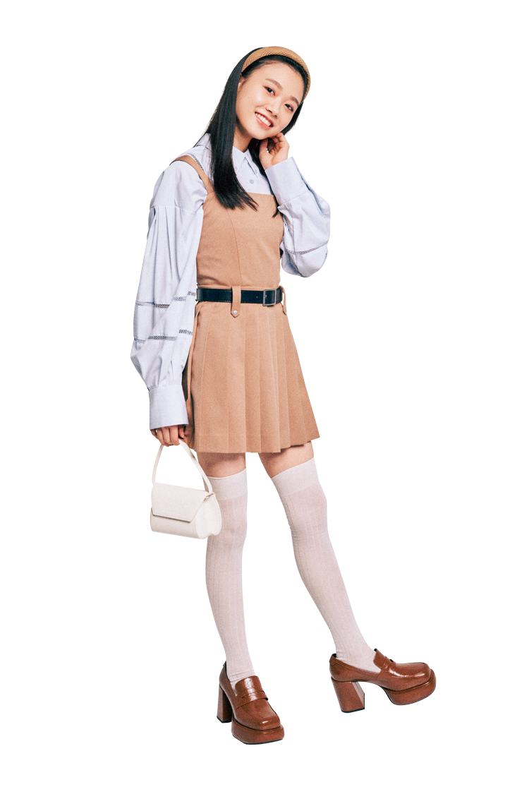 ベルトつきプリーツミニワンピース 13,200円/Darich(YSM) ライトブルーレースシャツ 14,960円/LILY BROWN カチューシャ 550円/パリスキッズ 原宿店 バッグ 7,900円、ローファー 11,500円/ともにチャールズ&キース(チャールズ&キース ジャパン) ニーハイソックス 1,760円/靴下屋(Tabio) 撮影/藤原宏(Pygmy Company) スタイリング/杉本奈穂(KIND) ヘア&メイク/遊佐こころ モデル/髙橋ひかる、金川紗耶(ともに本誌専属)、美冴 文/小田和希子