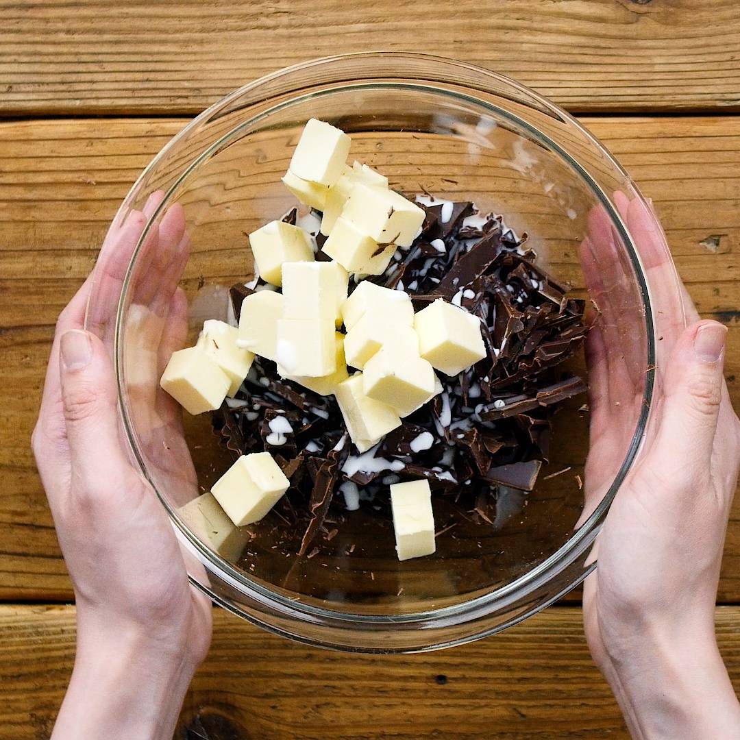 耐熱ボウルにチョコレート、バター、生クリームを入れ、レンジ600Wで1分50秒〜2分加熱します。