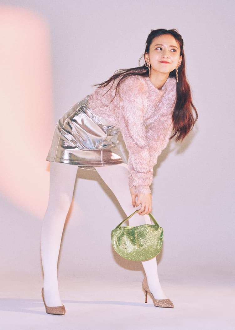 メタリック×ラメで盛りに盛る! ショート丈ニット×ミニスカでスタイルアップ♡ 白タイツでレトロな雰囲気を演出