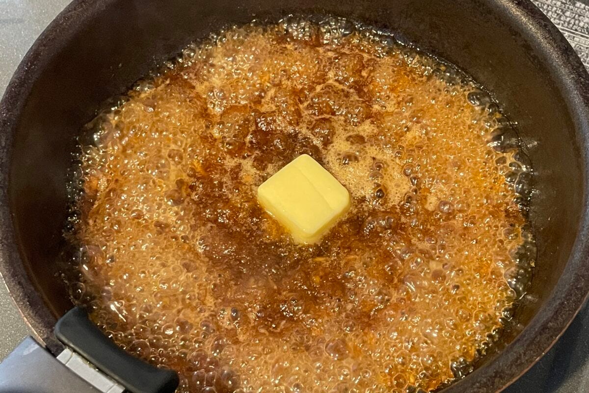 ステーキソースをフライパンに入れて弱めの中火で加熱。ソースが沸いて温まったらバター(10g)を入れて混ぜます。